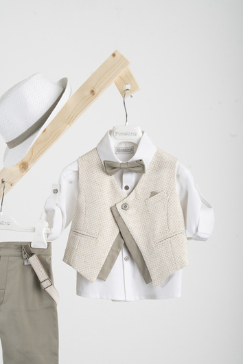 AG25S83.SAGE Βαπτιστικό κοστούμι Piccolino Felipe σε χρώμα Sage. Περιλαμβάνει κλασάτο σταυρωτό γιλέκο μονόκουμπο με διπλή λοξάδα σε διχρωμία, πουκάμισο λινό, παντελόνι βαμβακερό σε χρώμα sage, παπιγιόν μιας κατεύθυνσης με μύτη στο τελείωμα, τιράντες και καπέλο με φάσα. Διαθέσιμο σε 4 μεγέθη 6-12, 12-18, 18-24, 24-36(εξτρά χρέωση)