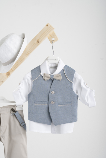 AG25S78.BLUESAND Βαπτιστικό κοστούμι Piccolino Francisco σε χρώμα Blue-Sand. Περιλαμβάνει δίχρωμο γιλέκο με διακοσμητικούς ωμίτες, πουκάμισο βαμβακερό λευκό, παντελόνι βαμβακερό σε χρώμα sand, παπιγιόν με διχρωμία, ζώνη με double D δέσιμο και καπέλο με φάσα. Διαθέσιμο σε 4 μεγέθη 6-12, 12-18, 18-24, 24-36(εξτρά χρέωση)