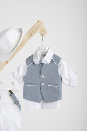 AG25S78.BLUEWHITEΒαπτιστικό κοστούμι Piccolino Francisco σε χρώμα Blue-White. Περιλαμβάνει δίχρωμο γιλέκο με διακοσμητικούς ωμίτες, πουκάμισο βαμβακερό λευκό, παντελόνι βαμβακερό σε χρώμα white, παπιγιόν με διχρωμία, ζώνη με double D δέσιμο και καπέλο με φάσα. Διαθέσιμο σε 4 μεγέθη 6-12, 12-18, 18-24, 24-36(εξτρά χρέωση)