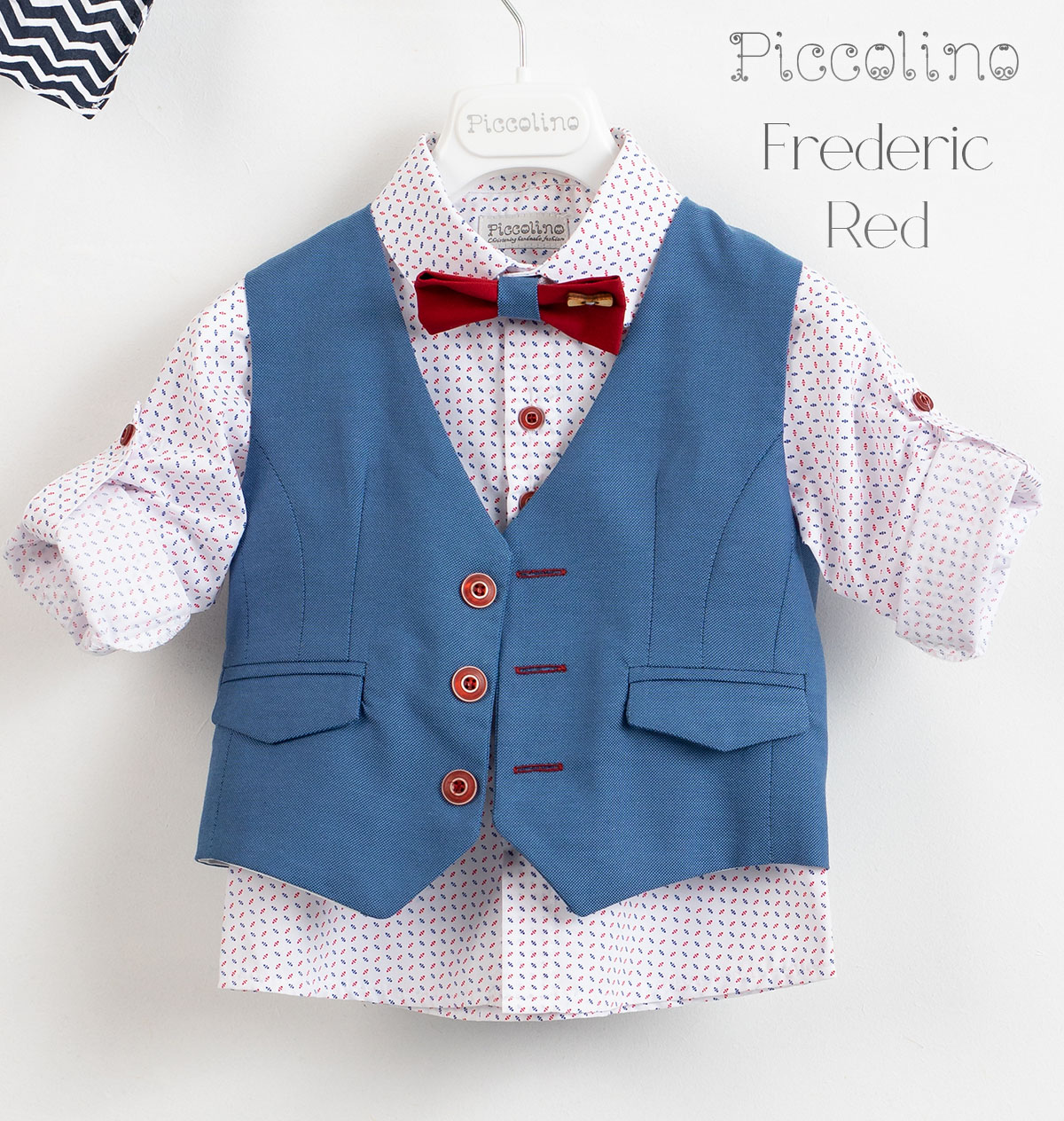 Βαπτιστικό κοστούμι Piccolino Frederic σε χρώμα Red. Περιλαμβάνει βαμβακερό κλάσατο γιλέκο με, πουκάμισο βαμβακερό λευκό με σχέδια, παντελόνι βαμβακερό σε χρώμα red, δίχρωμο παπιγιόν με ξύλινη λεπτομέρεια , φουλάρι, τιράντες και καπέλο με φάσα. Διαθέσιμο σε 4 μεγέθη 6-12, 12-18, 18-24, 24-36(εξτρά χρέωση)