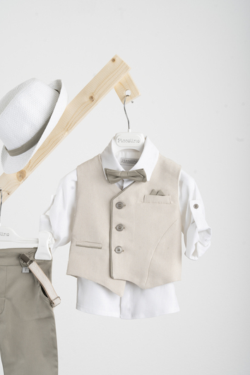 AG25S76.SAGEΒαπτιστικό κοστούμι Piccolino Gustavo σε χρώμα Sage. Περιλαμβάνει γιλέκο asia style σε μπεζ ΄΄ψαροκόκκαλο΄΄, πουκάμισο βαμβακερό λευκό, παντελόνι βαμβακερό σε χρώμα Sage, παπιγιόν μιας κατεύθυνσης με μύτη στο τελείωμα, τιράντες και καπέλο με φάσα. Διαθέσιμο σε 4 μεγέθη 6-12, 12-18, 18-24, 24-36(εξτρά χρέωση)