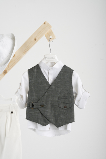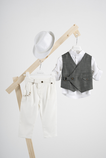 AG25S85.WHITE Βαπτιστικό κοστούμι Piccolino Jose σε χρώμα White. Περιλαμβάνει σταυρωτό λινό γιλέκο με διακοσμητικά μεταλικά κουμπια και ιμάντα με D δέσιμο, πουκάμισο mao λινό, παντελόνι λινό βράκα με πιέτες με διακοσμητικό κρεμαστό με χάντρες σε χρώμα white, φουλάρι και καπέλο με φάσα. Διαθέσιμο σε 4 μεγέθη 6-12, 12-18, 18-24, 24-36(εξτρά χρέωση)