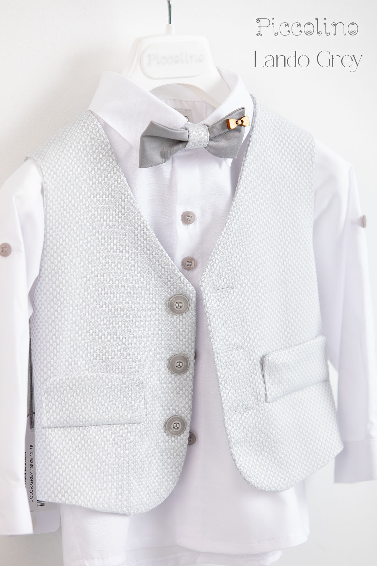 Βαπτιστικό κοστούμι Piccolino Lando σε χρώμα Grey. Περιλαμβάνει γιλέκο γκρι με λεπτομέρειες, πουκάμισο βαμβακερό λευκό oxford, παντελόνι βαμβακερό σε χρώμα γκρι, παπιγιόν με ξύλινη λεπτομέρεια, τιράντες και καπέλο με φάσα. Διαθέσιμο σε 4 μεγέθη 6-12, 12-18, 18-24, 24-36(εξτρά χρέωση)