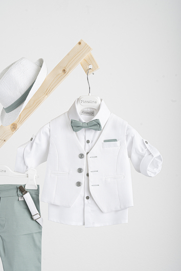 AG25S75.MINT Βαπτιστικό κοστούμι Piccolino Lorenzo σε χρώμα Mint. Περιλαμβάνει λευκό γιλέκο, πουκάμισο βαμβακερό λευκό, παντελόνι βαμβακερό σε χρώμα mint, παπιγιόν μιας κατεύθυνσης με μύτη στο τελείωμα, τιράντες και καπέλο με φάσα. Διαθέσιμο σε 4 μεγέθη 6-12, 12-18, 18-24, 24-36(εξτρά χρέωση)