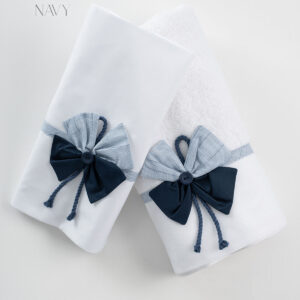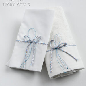 Σετ λαδόπανα Piccolino LK-NOVA IVORY. Αποτελείται απο βαμβακερό λαδόπανο, πετσέτα 140*70εκ, εσώρουχα και πετσέτα ιερέα 30*50εκ. Στολισμένα με χειροποίητα υφασμάτινα λουλούδια. Συνοδευτικό του φορέματος Piccolino NOVA IVORY
