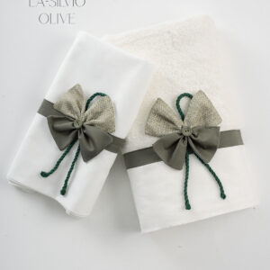 Σετ λαδόπανα Piccolino LK-ELENA IVORY. Αποτελείται απο βαμβακερό λαδόπανο, πετσέτα 140*70εκ, εσώρουχα και πετσέτα ιερέα 30*50εκ. Στολισμένα με χειροποίητα υφασμάτινα λουλούδια. Συνοδευτικό του φορέματος Piccolino GIANNA Ivory