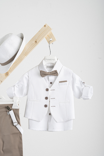 AG25S75.MOCHA Βαπτιστικό κοστούμι Piccolino Lorenzo σε χρώμα Mocha. Περιλαμβάνει λευκό γιλέκο, πουκάμισο βαμβακερό λευκό, παντελόνι βαμβακερό σε χρώμα mocha, παπιγιόν μιας κατεύθυνσης με μύτη στο τελείωμα, τιράντες και καπέλο με φάσα. Διαθέσιμο σε 4 μεγέθη 6-12, 12-18, 18-24, 24-36(εξτρά χρέωση)