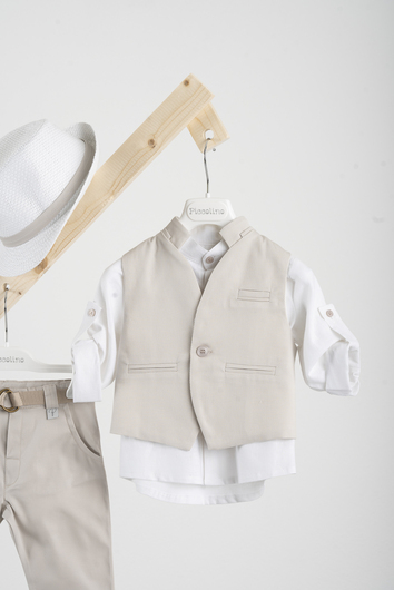 AG23S59.SAND Βαπτιστικό κοστούμι Piccolino Luciano σε χρώμα Sand. Περιλαμβάνει γιλέκο μονόκουμπο, πουκάμισο με γιακά μαο λινό εκρού, παντελόνι σε χρώμα ivory, ζώνη με double D δέσιμο και καπέλο με φάσα. Διαθέσιμο σε 4 μεγέθη 6-12, 12-18, 18-24, 24-36(εξτρά χρέωση)