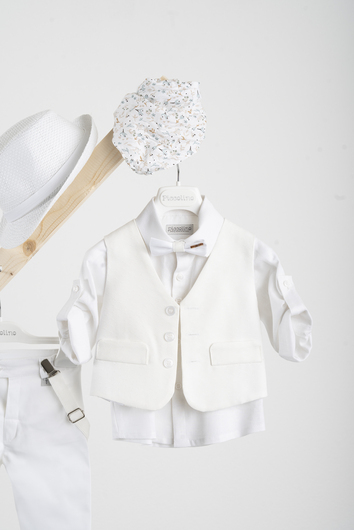 AG25S77.WHITE Βαπτιστικό κοστούμι Piccolino Pablo σε χρώμα White. Περιλαμβάνει γιλέκο λευκο με λεπτομέρειες πουά, πουκάμισο λινό, παντελόνι βαμβακερό σε χρώμα white, παπιγιόν με ξύλινη λεπτομέρεια, τιράντες και καπέλο με φάσα. Διαθέσιμο σε 4 μεγέθη 6-12, 12-18, 18-24, 24-36(εξτρά χρέωση)