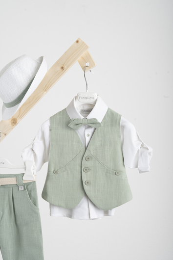 AG25S81.MINT Βαπτιστικό κοστούμι Piccolino Rafael σε χρώμα Mint. Περιλαμβάνει λινό γιλέκο καμπυλόγραμμο, πουκάμισο λινό, παντελόνι λινό σε χρώμα mint, παπιγιόν διπλό με μύτες , ζώνη με double D δέσιμο και καπέλο με φάσα. Διαθέσιμο σε 4 μεγέθη 6-12, 12-18, 18-24, 24-36(εξτρά χρέωση)