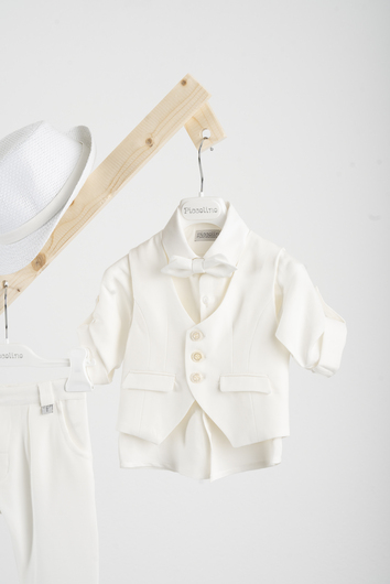 AG25S82.IVORY Βαπτιστικό κοστούμι Piccolino Rodrigo σε χρώμα Ivory. Περιλαμβάνει κλασάτο γιλέκο, πουκάμισο λινό, παντελόνι σε χρώμα ivory με πιέτες, παπιγιόν διπλό με μύτες και καπέλο με φάσα. Διαθέσιμο σε 4 μεγέθη 6-12, 12-18, 18-24, 24-36(εξτρά χρέωση)