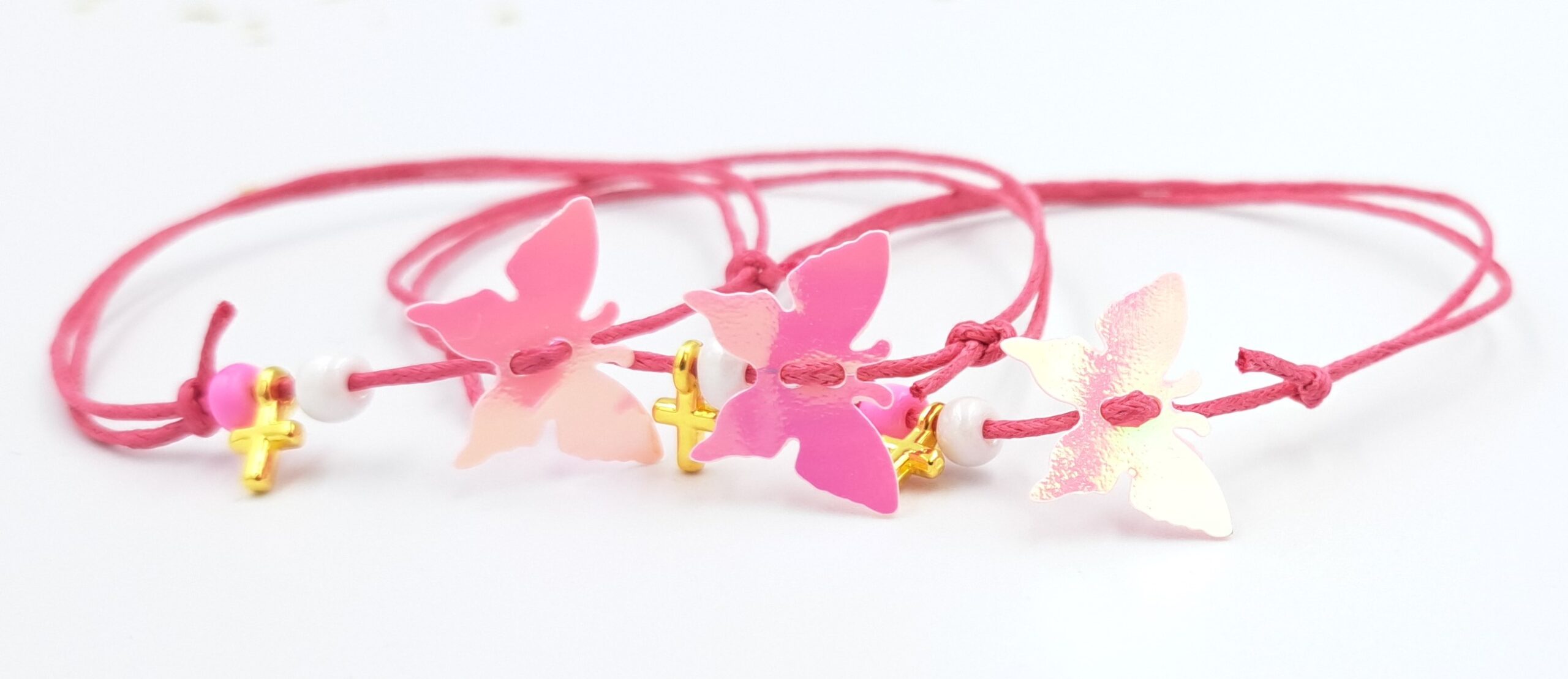 Μαρτυρικό βραχιόλι σε φούξια απόχρωση πεταλούδα ροζ και σταυρό. Οι φωτογραφίες έχουν υποστεί επεξεργασία και τα χρώματα διαφέρουν λίγο στην πραγματικότητα. Η τιμή αφορά συσκευασία 50 τεμαχίων.