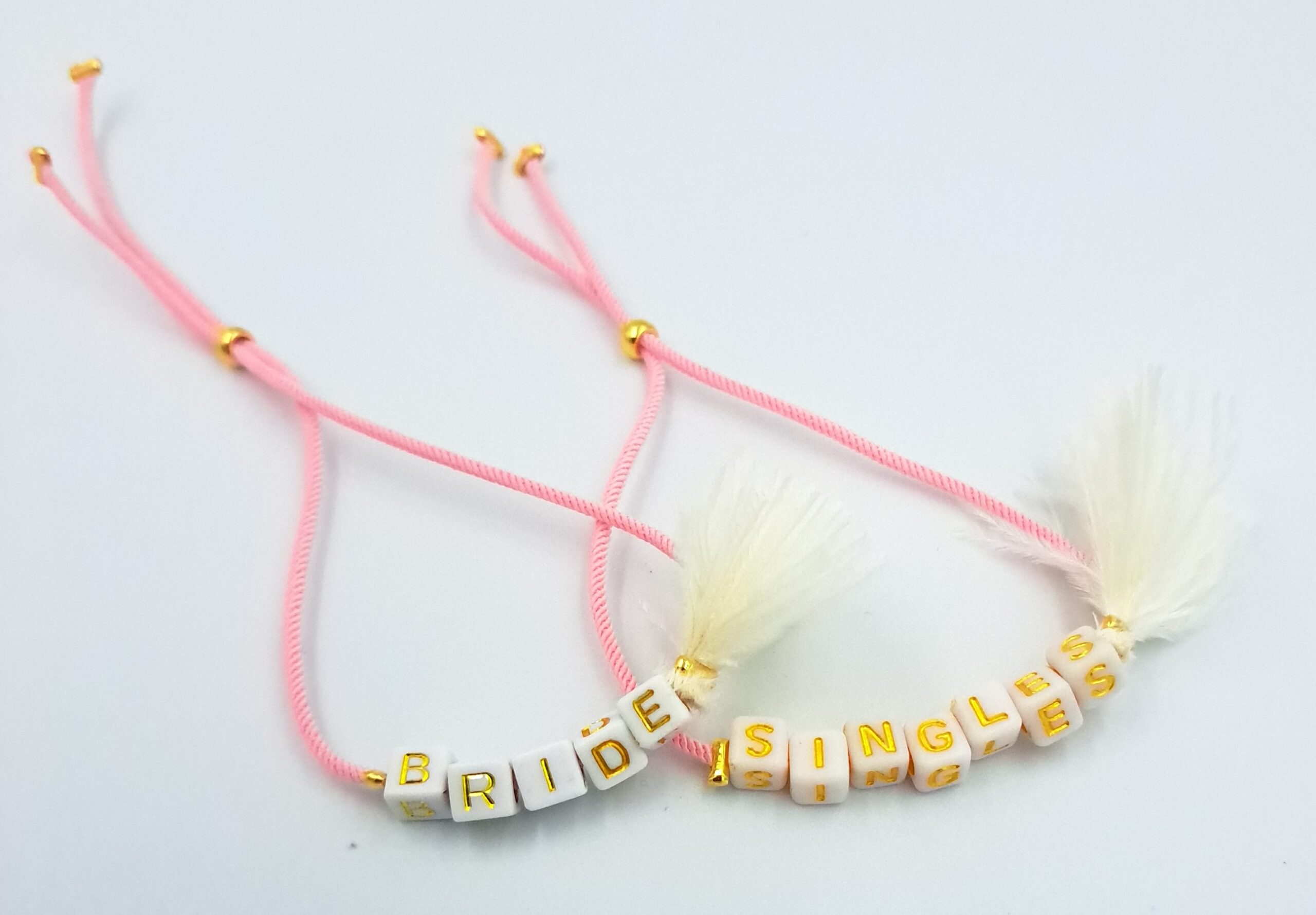 Βραχιόλι, ροζ κορδόνι, λευκό φτερό,bride και singles. Οι φωτογραφίες έχουν υποστεί επεξεργασία και τα χρώματα ίσως να διαφέρουν λίγο στην πραγματικότητα. Η Τιμή αφορά συσκευασία 5 τεμαχίων.