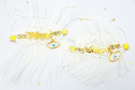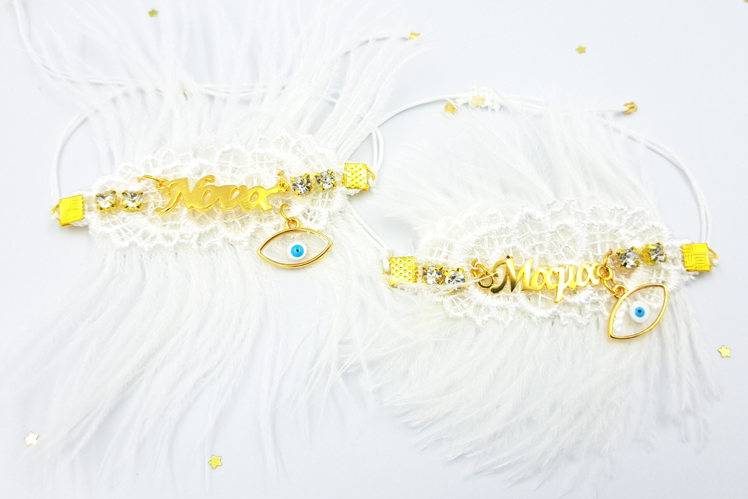 Βραχιόλι λευκό με στρας και μάτι, λευκό φτερό, για την μαμά, την νονά και την γιαγιά. Οι φωτογραφίες έχουν υποστεί επεξεργασία και τα χρώματα ίσως να διαφέρουν λίγο στην πραγματικότητα. Η Τιμή αφορά συσκευασία 2 τεμαχίων.