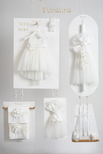 Σετ βάπτισης Piccolino VERA IVORY. Περιλαμβάνει λαδόπανο (πετσέτα 450gsm και σεντόνι 70*140εκ, εσώρουχα και πετσέτα ιερέα), λαμπάδα στολισμένη, στολισμό συσκευασίας (μπραντς), λαδοσέτ (στολισμένα 3κεράκια, μπουκαλάκι,σαπούνι) .Το ρούχο δεν περιλαμβάνεται στην τιμη του σετ βάπτισης.