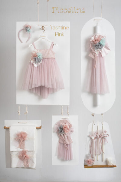 Σετ βάπτισης Piccolino YASMINE PINK. Περιλαμβάνει λαδόπανο (πετσέτα 450gsm και σεντόνι 70*140εκ, εσώρουχα και πετσέτα ιερέα), λαμπάδα στολισμένη, στολισμό συσκευασίας (μπραντς), λαδοσέτ (στολισμένα 3κεράκια, μπουκαλάκι,σαπούνι) .Το ρούχο δεν περιλαμβάνεται στην τιμη του σετ βάπτισης.