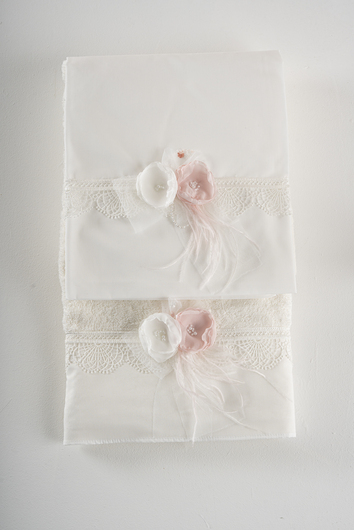 Σετ λαδόπανα Piccolino. Αποτελείται απο βαμβακερό λαδόπανο, πετσέτα 140*70εκ, εσώρουχα και πετσέτα ιερέα 30*50εκ. Στολισμένα με χειροποίητα υφασμάτινα λουλούδια. LK-CONSTANCE.PINK