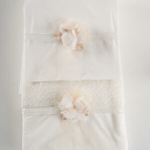 Σετ λαδόπανα Piccolino. Αποτελείται απο βαμβακερό λαδόπανο, πετσέτα 140*70εκ, εσώρουχα και πετσέτα ιερέα 30*50εκ. Στολισμένα με χειροποίητα υφασμάτινα λουλούδια. LK-MARILITA.IVORY