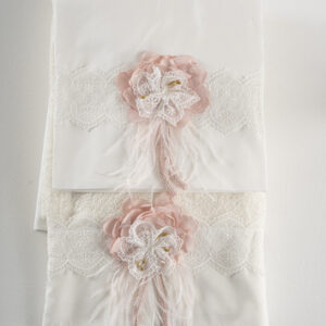 Σετ λαδόπανα Piccolino. Αποτελείται απο βαμβακερό λαδόπανο, πετσέτα 140*70εκ, εσώρουχα και πετσέτα ιερέα 30*50εκ. Στολισμένα με χειροποίητα υφασμάτινα λουλούδια. LK-CONSTANCE.PINK