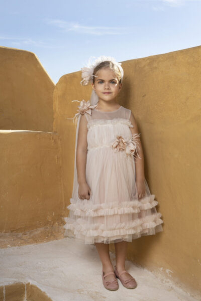 Ξεχωριστό φόρεμα Baby Βloom της συλλογής stile di vita mediterraneo 2024 που συνδυάζει τούλι σε απόχρωση πούδρας κ τούλι κεντητό πουά για αυτό το μοναδικό αποτέλεσμα. Ιδιαίτερη βαμβακερή δαντέλα στολίζει το μπούστο και την V πλάτη όπως και την μέση του φορέματος σε συνδυασμό με τα χειροποίητα λουλούδια. Η εσωτερική επένδυση του φορέματος αποτελείται από εσωτερικό βαμβακερό ύφασμα.