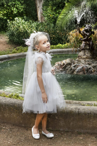 Ρομαντικό φόρεμα βάπτισης Baby Βloom της συλλογής stile di vita mediterraneo 2024 σε ιβουάρ απόχρωση με κορσάζ που στολίζει ιδιαίτερη δανδέλα που καλύπτει και τους ώμους του παιδιού. Αυτό το εκπληκτικό αποτέλεσμα συμπληρώνει η πλούσια τούλινη ζώνη στην μέση του φορέματος με μια σύνθεση από χειροποίητα λουλούδια. Εσωτερικά υπάρχει επένδυση από από μαλακό βαμβακερό τούλι.