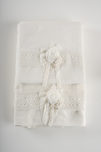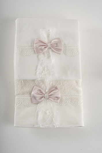 Σετ λαδόπανα Piccolino. Αποτελείται απο βαμβακερό λαδόπανο, πετσέτα 140*70εκ, εσώρουχα και πετσέτα ιερέα 30*50εκ. Στολισμένα με χειροποίητα υφασμάτινα λουλούδια. LK-MICHELE.IVORY