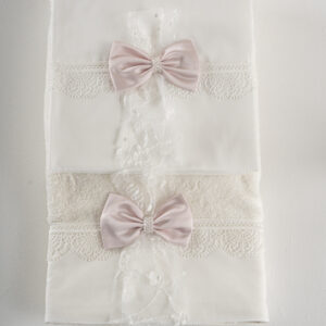 Σετ λαδόπανα Piccolino. Αποτελείται απο βαμβακερό λαδόπανο, πετσέτα 140*70εκ, εσώρουχα και πετσέτα ιερέα 30*50εκ. Στολισμένα με χειροποίητα υφασμάτινα λουλούδια. LK-MICHELE.IVORY