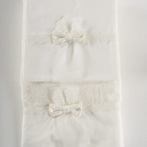 Σετ λαδόπανα Piccolino. Αποτελείται απο βαμβακερό λαδόπανο, πετσέτα 140*70εκ, εσώρουχα και πετσέτα ιερέα 30*50εκ. Στολισμένα με χειροποίητα υφασμάτινα λουλούδια. LK-MICHELE.IVORY