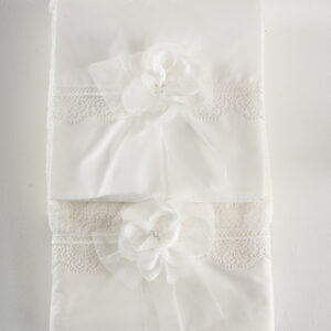 Σετ λαδόπανα Piccolino. Αποτελείται απο βαμβακερό λαδόπανο, πετσέτα 140*70εκ, εσώρουχα και πετσέτα ιερέα 30*50εκ. Στολισμένα με χειροποίητα υφασμάτινα λουλούδια. LK-ORNELLA.IVORY