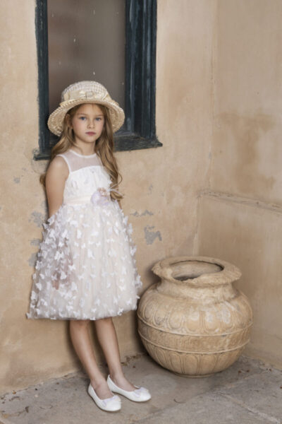 Μοναδικό φόρεμα βάπτισης Baby Βloom της συλλογής stile di vita mediterraneo 2024 σε σομόν απόχρωση με διαφάνεια στο μπούστο και τούλι κεντητό με πεταλούδες σε όλη την επιφάνεια του φορέματος . Εσωτερικά υπάρχει κεντητό τούλι πουά και μαλακό βαμβακερό ύφασμα. Την μέση του φορέματος αναδεικνύει η τούλινη ζώνη που δένει στο πίσω μέρος και η χειροποίητη σύνθεση λουλουδιών που την στολίζει.