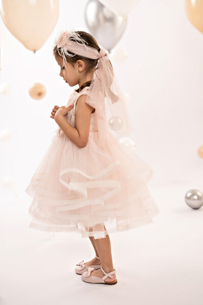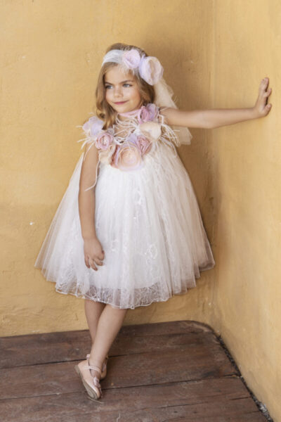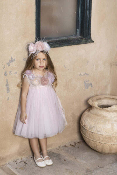 125103 Ένα φόρεμα βγαλμένο από όνειρο, σε αποχρώσεις misty rose που αποπνέει ρομαντισμό και φινέτσα. Το κρουαζέ, ντραπαριστό μπούστο από μαλακό τούλι αγκαλιάζει το σώμα ενώ τα χειροποίητα λουλούδια και τα αέρινα φτερά στολίζουν διακριτικά το σύνολο. Η φούστα, αέρινη και εκθαμβωτική, αποτελείται από πολλαπλές στρώσεις φίνας ποιότητας τούλι, δημιουργώντας πλούσιους κυματισμούς που χορεύουν με κάθε κίνηση. Η εμφάνιση ολοκληρώνεται με μια κομψή κορδέλα για τα μαλλιά, στολισμένη με τα ίδια λουλούδια και φτερά, για μια απόλυτα αρμονική και παραμυθένια αίσθηση.