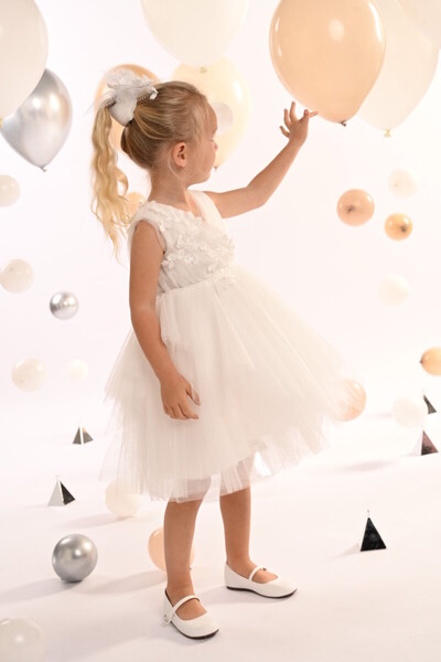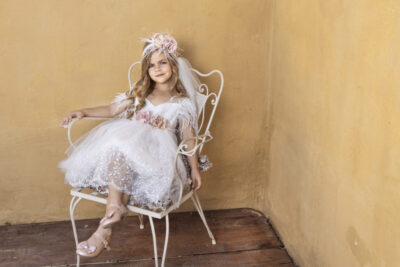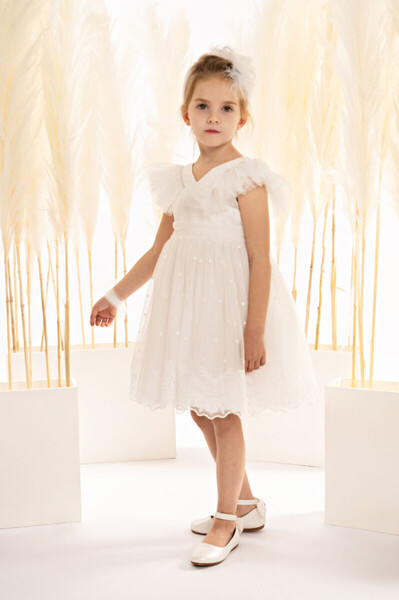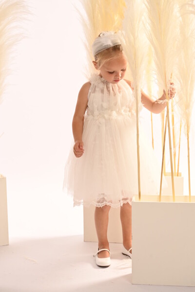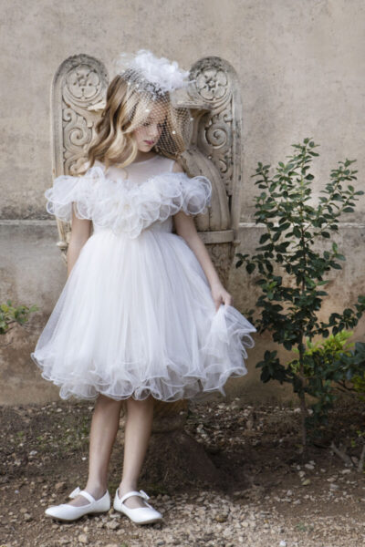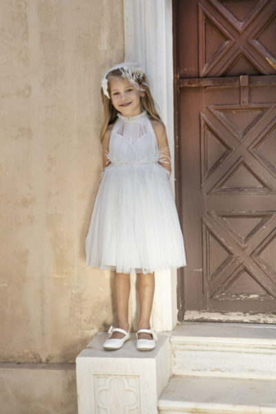 125108 Ένα φόρεμα που μοιάζει να έχει ξεπηδήσει από τις σελίδες ενός παραμυθιού! Σε εκρού απόχρωση, φτιαγμένο από υπέροχη κεντητή οργαντίνα με απλικέ λουλούδια και αέρινο πουά κεντητό τούλι. Το μπούστο με την εντυπωσιακή πλάτη, παίζει αρμονικά με τα κοψίματα, τις διαφάνειες και τις υφές, δημιουργώντας μια αέρινη αίσθηση και υπέροχα σχεδιαστικά σχήματα. Η φούστα σαν tutu μπαλαρίνας, είναι πλούσια και εντυπωσιακή, με διπλό βολάν από κεντημένο πουά τούλι, προσθέτοντας όγκο, χάρη και κίνηση σε κάθε βήμα. Το σύνολο ολοκληρώνεται με μια ρομαντική κορδέλα για τα μαλλιά, διακοσμημένη με φιόγκο από τούλι και αέρινα φτερά.