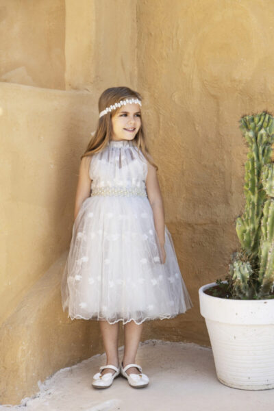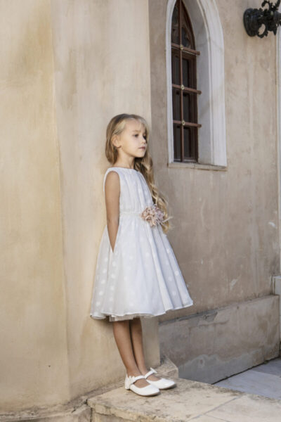 125114 Ένα πανέμορφο φόρεμα σε εκρού χρώμα, φτιαγμένο από λεπτό πουά κεντημένο τούλι που αποπνέει μια αίσθηση ρετρό κομψότητας. Το μπούστο από πουά τούλι, έχει γαλλική δαντέλα σε σχήμα καρδίας στο στήθος και ντουμπλάρισμα από ύφασμα με διάφανες παγιέτες για διακριτική λάμψη. Η τρέσα δημιουργεί μια «διακοσμητική» τιράντα που στολίζει υπέροχα το φόρεμα στο εμπρός αλλά και το πίσω μέρος του κορσάζ. Η σουρωτή φούστα, από πουά κεντητό τούλι με φαρδύ βολάν στο τελείωμα, προσφέρει πλούσιο όγκο και ζωντανή κίνηση, ενώ η κορδέλα για τα μαλλιά στολίζεται με δύο χειροποίητα λουλούδια σε αποχρώσεις σάπιου μήλου και μπεζ ολοκληρώνοντας την ονειρική εικόνα.