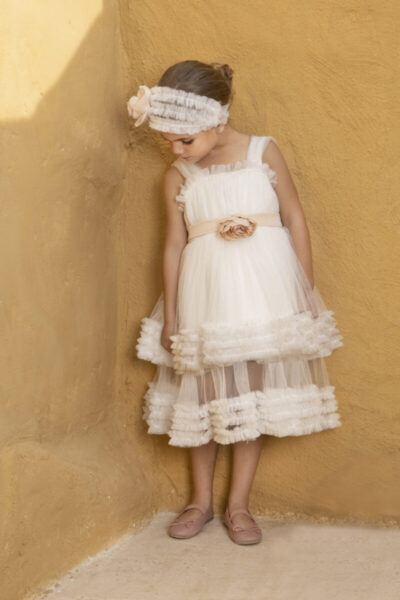 ολοκληρώνεται με κορδέλα μαλλιών διακοσμημένη με πλούσιο τούλινο βολάν. Όλα τα