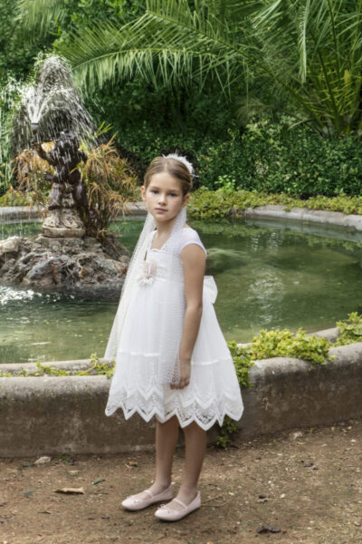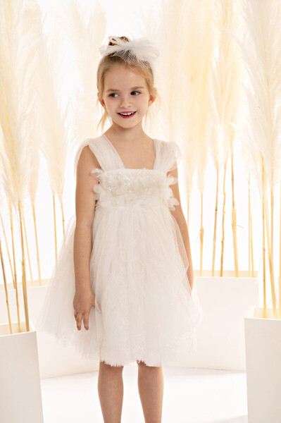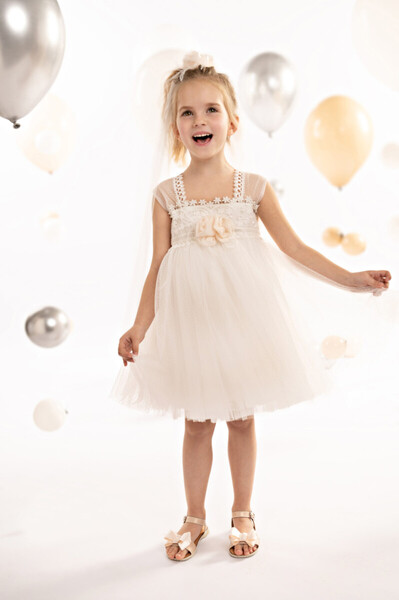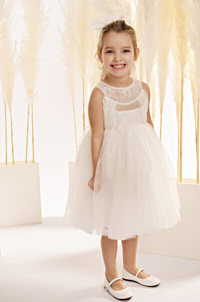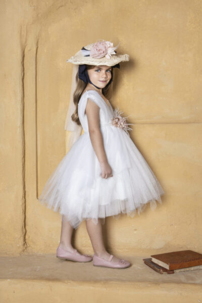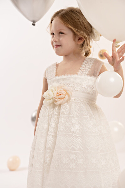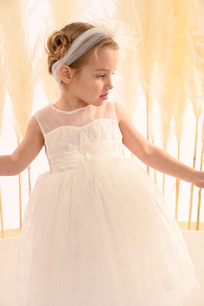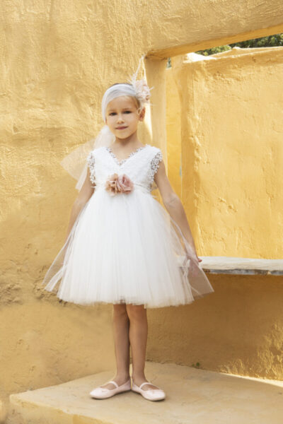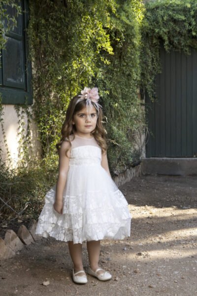 125119 Ένα ονειρεμένο αμπίρ φόρεμα σε λευκό χρώμα, με μπούστο φτιαγμένο από δαντέλα και φαρδιές τιράντες από micro πουά τούλι. Η φούστα με πλούσιες σούρες από δαντέλα και glitter τούλι χαρίζει αέρινη κίνηση και λάμψη. Η ζώνη από τούλι, που δένει πίσω, στολίζεται υπέροχα με δύο χειροποίητα διακοσμητικά τριαντάφυλλα από σατέν σε ροζ και εκρού χρώμα, προσθέτοντας μια ρομαντική πινελιά τόσο στο φόρεμα όσο και στην ασορτί κορδέλα μαλλιών. Όλα τα φορέματα διαθέτουν βαμβακερή φόδρα και φουρό.