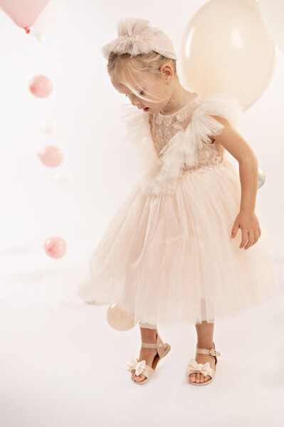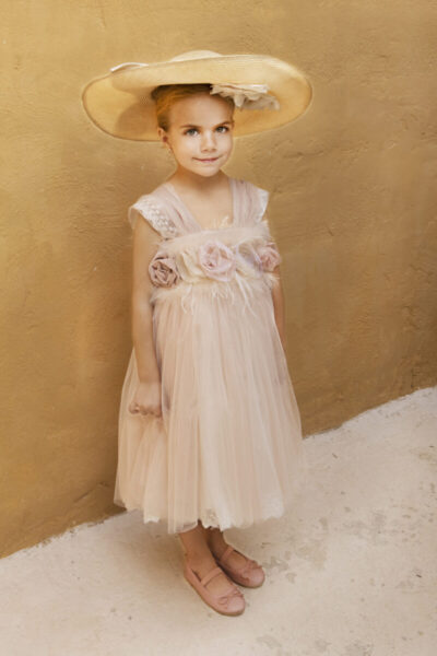 Φόρεμα Baby Βloom της συλλογής stile di vita mediterraneo 2024 στο χρώμα της πούδρας για μια ξεχωριστή εμφάνιση την ημέρα της βάπτισης. Εκπληκτικό μπούστο με διαφάνεια που το στολίζει διάφανη τρέσα με κρυσταλλάκια και πλούσια τούλινη φούστα που δίνει αέρινη κίνηση. Η εσωτερική επένδυση του φορέματος αποτελείται από εσωτερικό βαμβακερό ύφασμα.