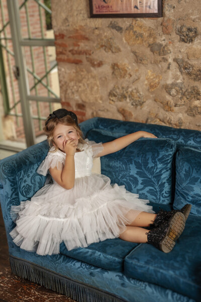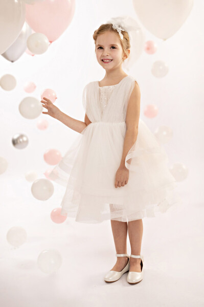 124600 Ένα παραμυθένιο, λαμπερό φόρεμα φτιαγμένο εξ ολοκλήρου από μαλακό τούλι που παίζει με τις διαφάνειες σε off white χρώμα. Το μπούστο ντραπαριστό με ιδιαίτερα εντυπωσιακή πλάτη και λεπτομέρειες από κεντημένες παγιέτες και χάντρες. Η φούστα του φορέματος αποτελείται από δύο στρώσεις, διακοσμημένες με βολάν. Το φόρεμα δένει στο πίσω μέρος με ζώνη, ενώ το σύνολο ολοκληρώνεται με μια κορδέλα μαλλιών διακοσμημένη με χειροποίητα λουλούδια. Όλα τα φορέματα μας έχουν βαμβακερή φόδρα και φουρό.