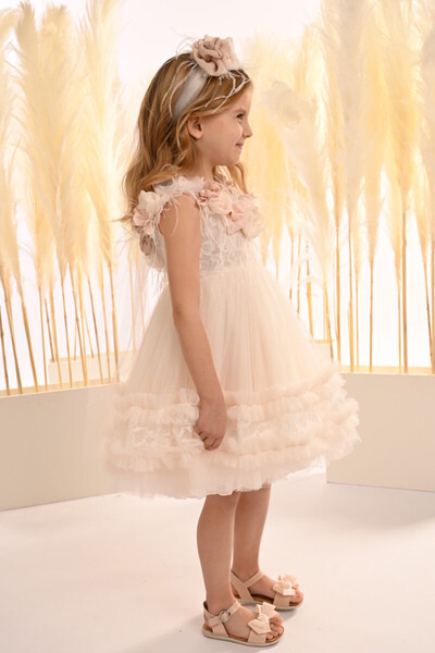 125116 Αυτό το ονειρικό φόρεμα σε απόχρωση misty rose είναι η επιτομή της ρομαντικής κομψότητας. Το μπούστο, φτιαγμένο εξολοκλήρου από ντουμπλαρισμένη δαντέλα, αναδεικνύεται μέσα από την ανοιχτή λαιμόκοψη, περίτεχνα στολισμένη με χειροποίητα λουλούδια εκρού, μπεζ και misty rose. Οι λεπτομέρειες από αέρινα φτερά στρουθοκαμήλου και στρας χαρίζουν μια μαγευτική λάμψη, σαν ψίθυρος πολυτέλειας. Η φούστα, με την πλούσια σούρα από απαλό τούλι και δαντέλα, κινείται με χάρη και ελαφρότητα, ενώ μια σειρά από μικρά βολάν προσθέτει μια παιχνιδιάρικη, ρομαντική πινελιά. Η εμφάνιση ολοκληρώνεται με κορδέλα για τα μαλλιά, διακοσμημένη με τα ίδια φίνα λουλούδια και φτερά, συνθέτοντας ένα σύνολο που θυμίζει παραμυθένιο όνειρο.